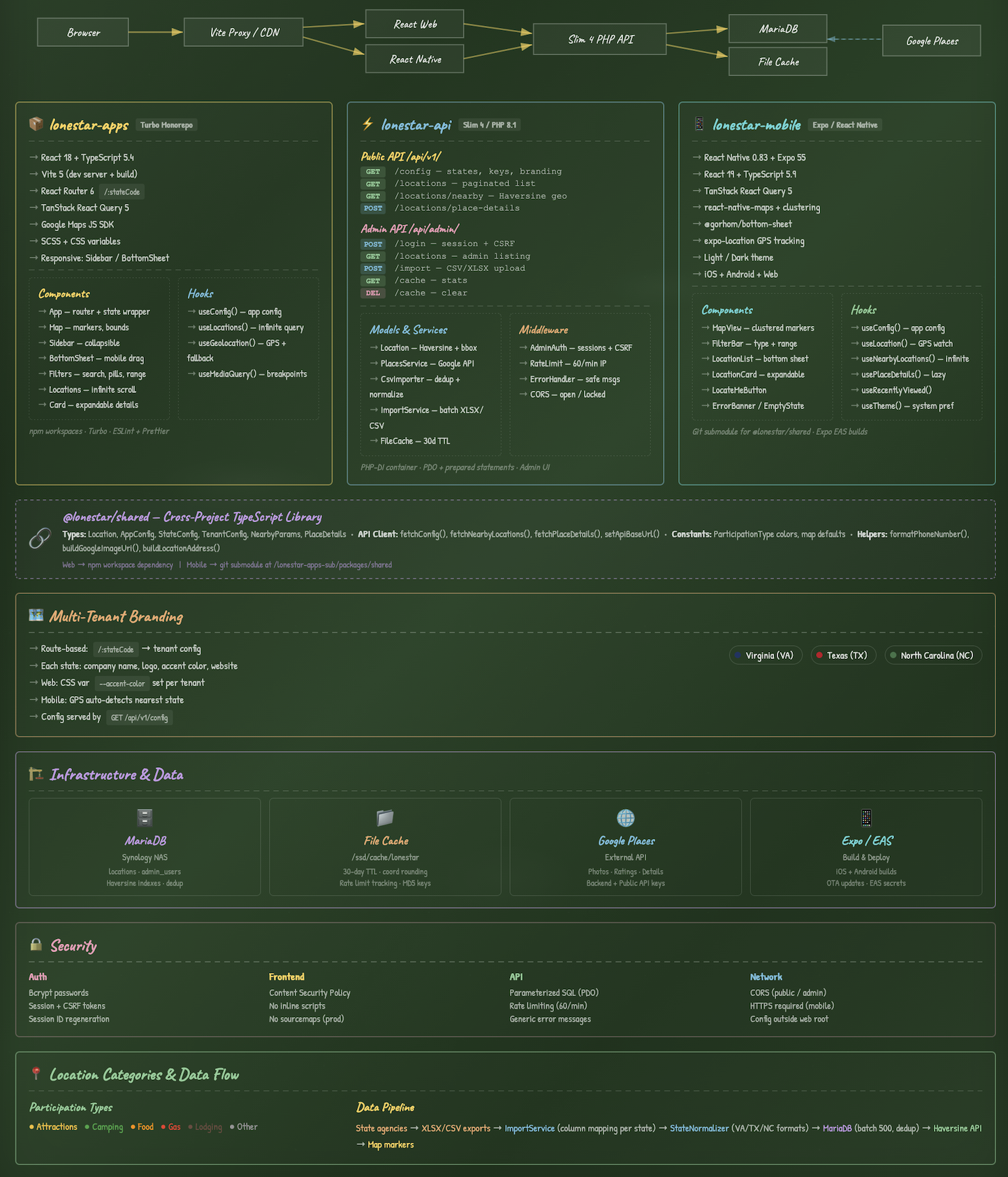 87 commits across 3 new repositories in a day. A standalone Slim 4 PHP API with rate limiting and admin authentication. A redesigned Vite React web app with tenant branding, full-bleed map, and a road-trip-themed landing page. A React Native mobile app with GPS-first navigation, dark mode, map clustering, and pull-to-refresh. A Turborepo monorepo sharing types and business logic across web and mobile.